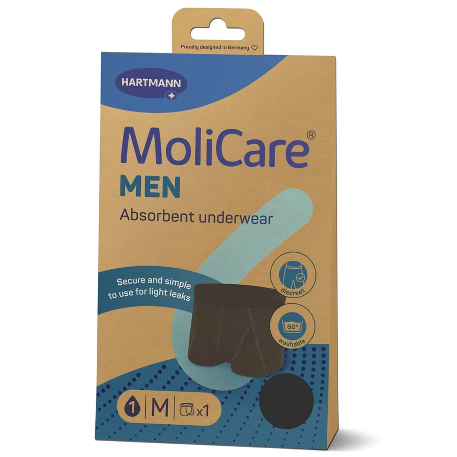 A MoliCare® MEN mosható férfi nedvszívó alsónemű ideális megoldás azoknak a férfiaknak, akik enyhe vizeletcsepegéssel vagy hólyaggyengeséggel küzdenek, és egy kényelmes, környezetbarát megoldást keresnek. Megjelenése és viselete olyan, mint a hagyományos férfi alsónemű, így biztosítva a maximális kényelmet és diszkréciót a mindennapok során.