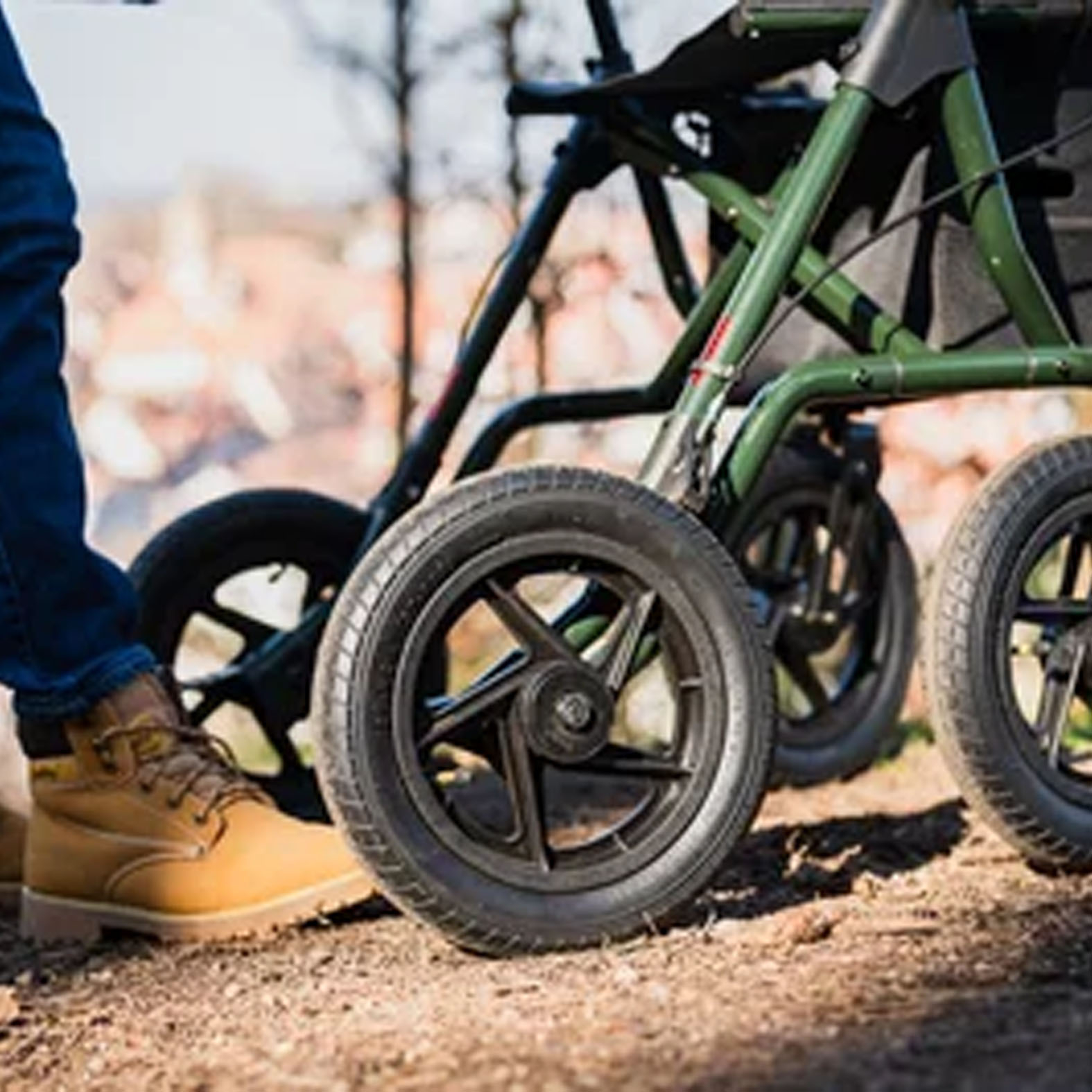A kültéri rollátor levegős gumiabroncsai kiváló ütéscsillapítást és ízületvédelmet biztosítanak. A puha PU gumiabroncsokkal pedig defektálló és készen állsz bármire.