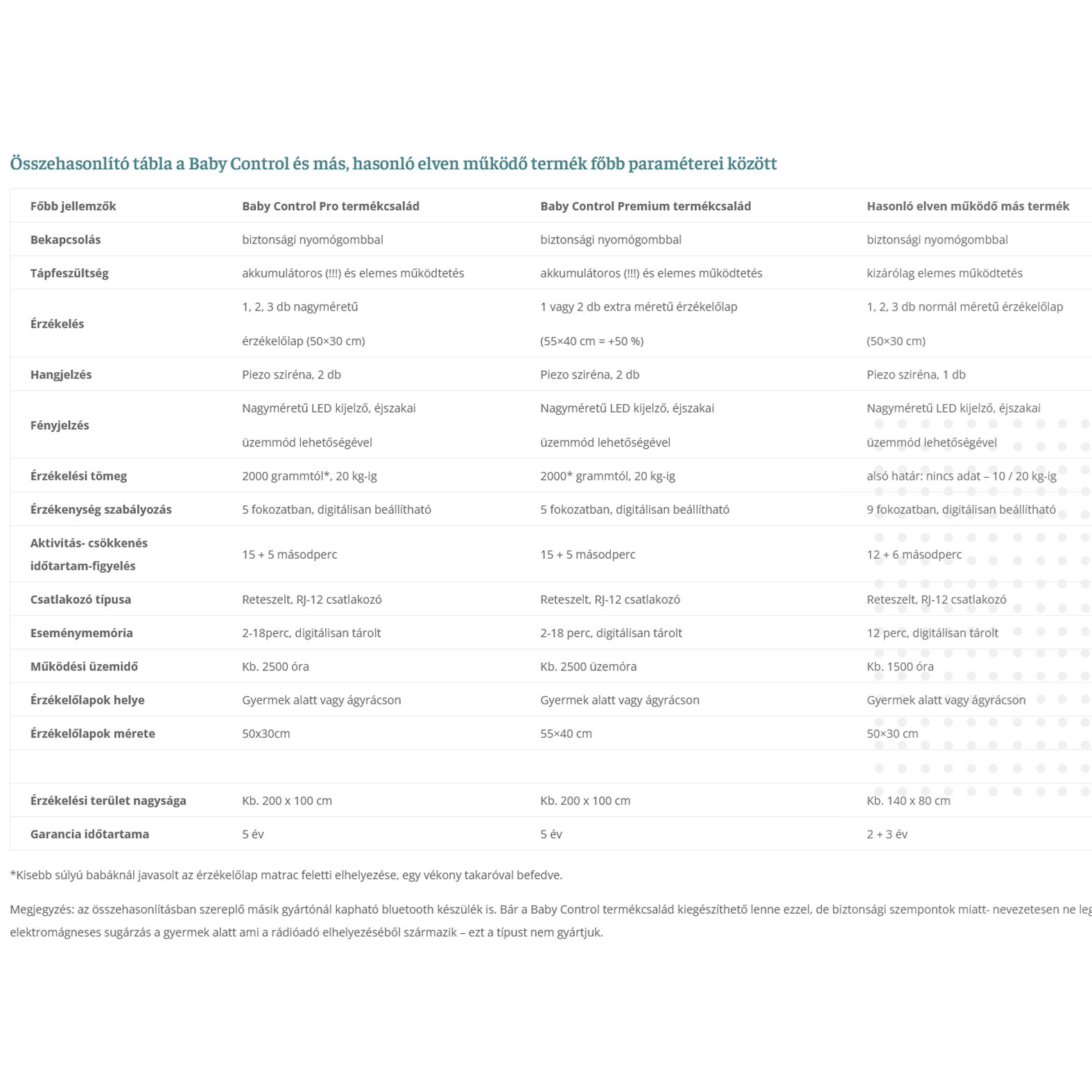 Új fejlesztésű termék a felhasználói tapasztalatok maximális figyelembe vételével. Digitális légzésfigyelő készülék 50%-kal megnövelt érzékelési felülettel – szinte minden méretű kiságyban – a teljes fekvőfelületet figyeli. Ha szükséges további érzékelőlappal bővíthető. Személyre szabható beállításokkal környezetbarát és fenntartható megoldásokkal tökéletes biztonságot nyújt a babának, nyugodt éjszakát a szülőknek.