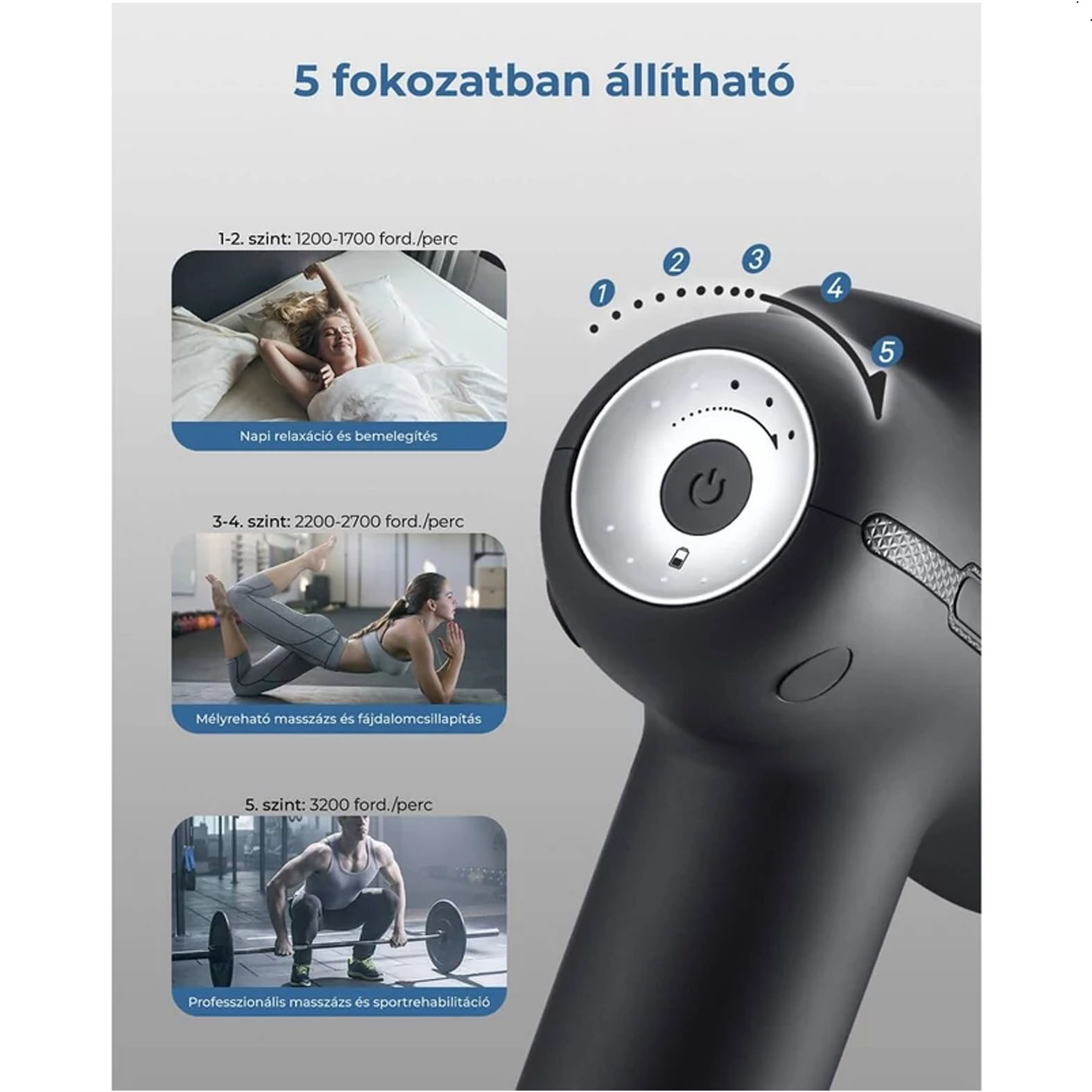 5 intenzitási szint, 1200-3200 fordulat/perc