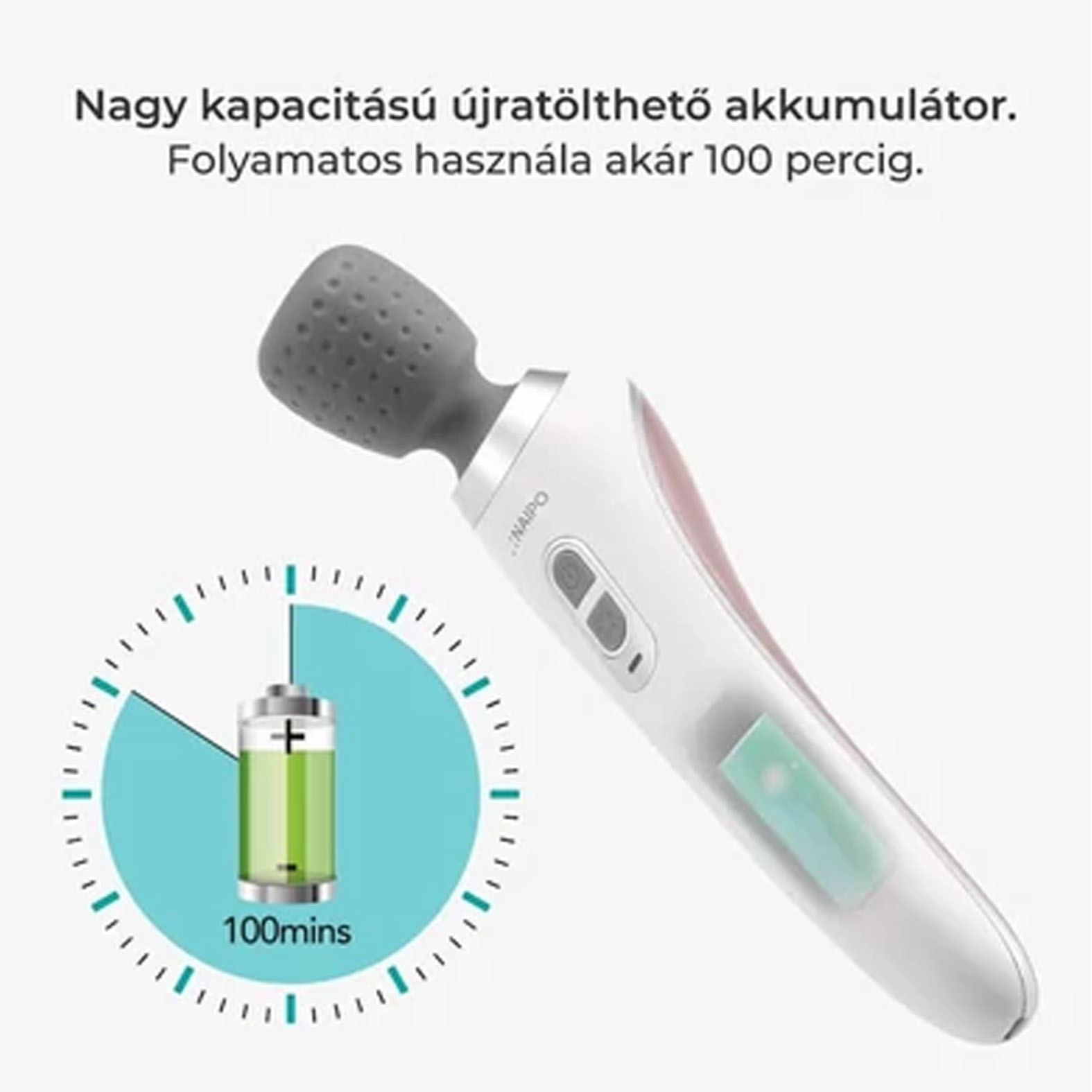 2-3 óra töltés után 100 perc vezeték nélküli masszázst képes biztosítani (töltés közben nem használható).