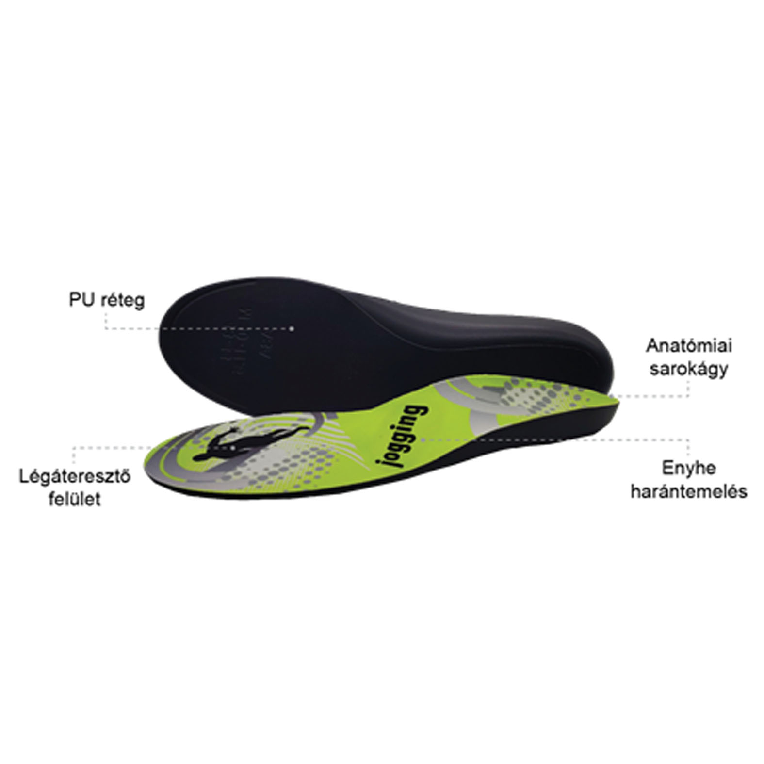Az anatómiai sarokágy stabilizál, az enyhe harántemelés támogatja a lábboltozatot, a rugalmas PU-réteg pedig kényelmes lépésérzetet és hatékony ütéscsillapítást ad.