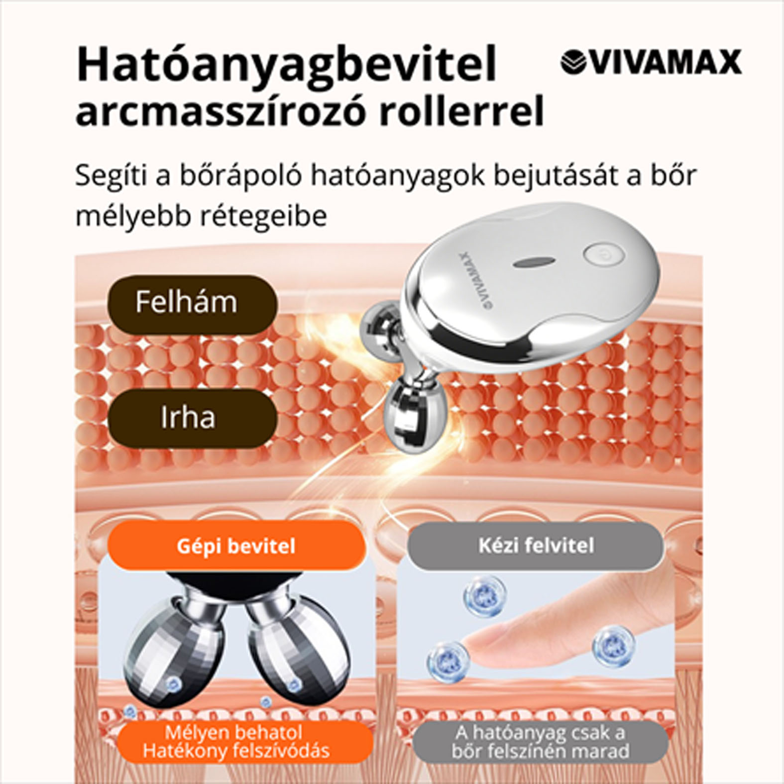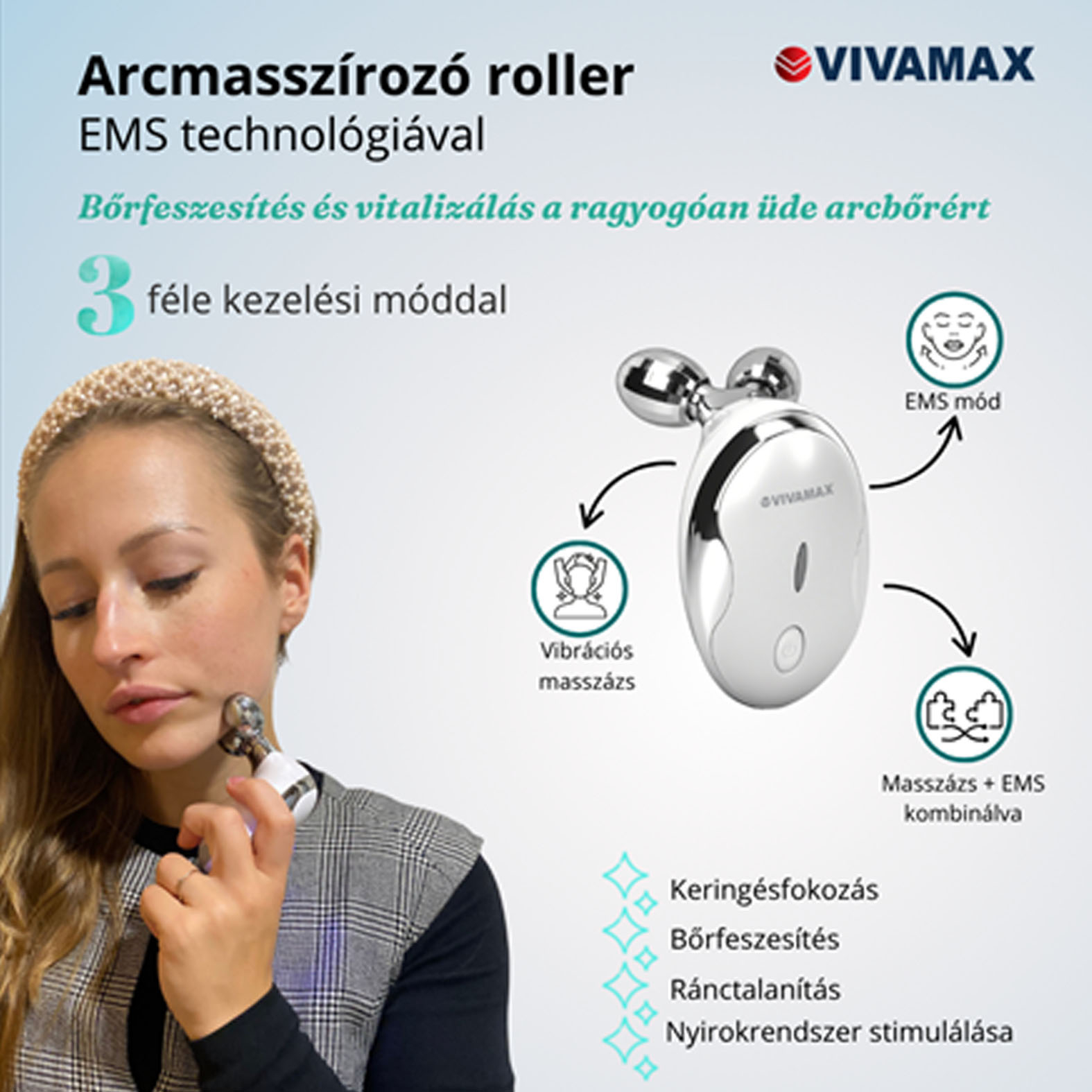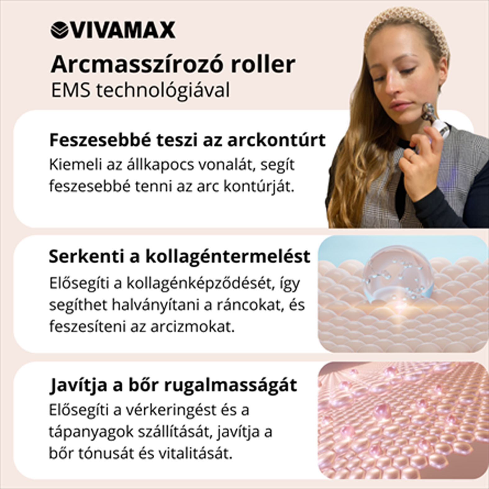 Vivamax arcápoló készülék EMS mikroáram (galván ion) és vibráció segítségével serkenti a vérkeringést, stimulálja az arcon található akupunktúrás pontokat, valamint segít a meridiánok tisztításában. Az EMS mikroáram képes stimulálni a bőr alatti szöveteket, aktiválni a sejteket, elősegíteni a kollagén termelés serkentését, ezáltal feszesebbé és ragyogóbbá téve a bőrt. Kompakt mérete és akkumulátoros kialakítása miatt könnyedén hordozható, így akár utazásokra is magával viheti, ergonomikus formája kényelmes és biztonságos fogást biztosít a kezelések során.