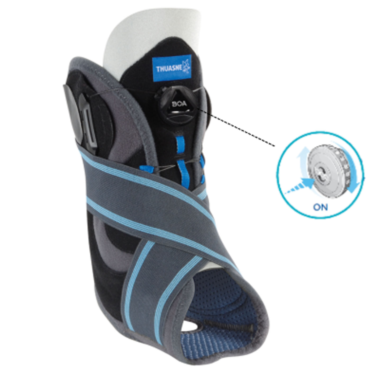 - Stabilizálás: a könnyű fém oldalsó megerősítések, a 8-ast formázó rugalmas pántokkal kombinálva fokozott ízületi megtámasztást biztosítanak.