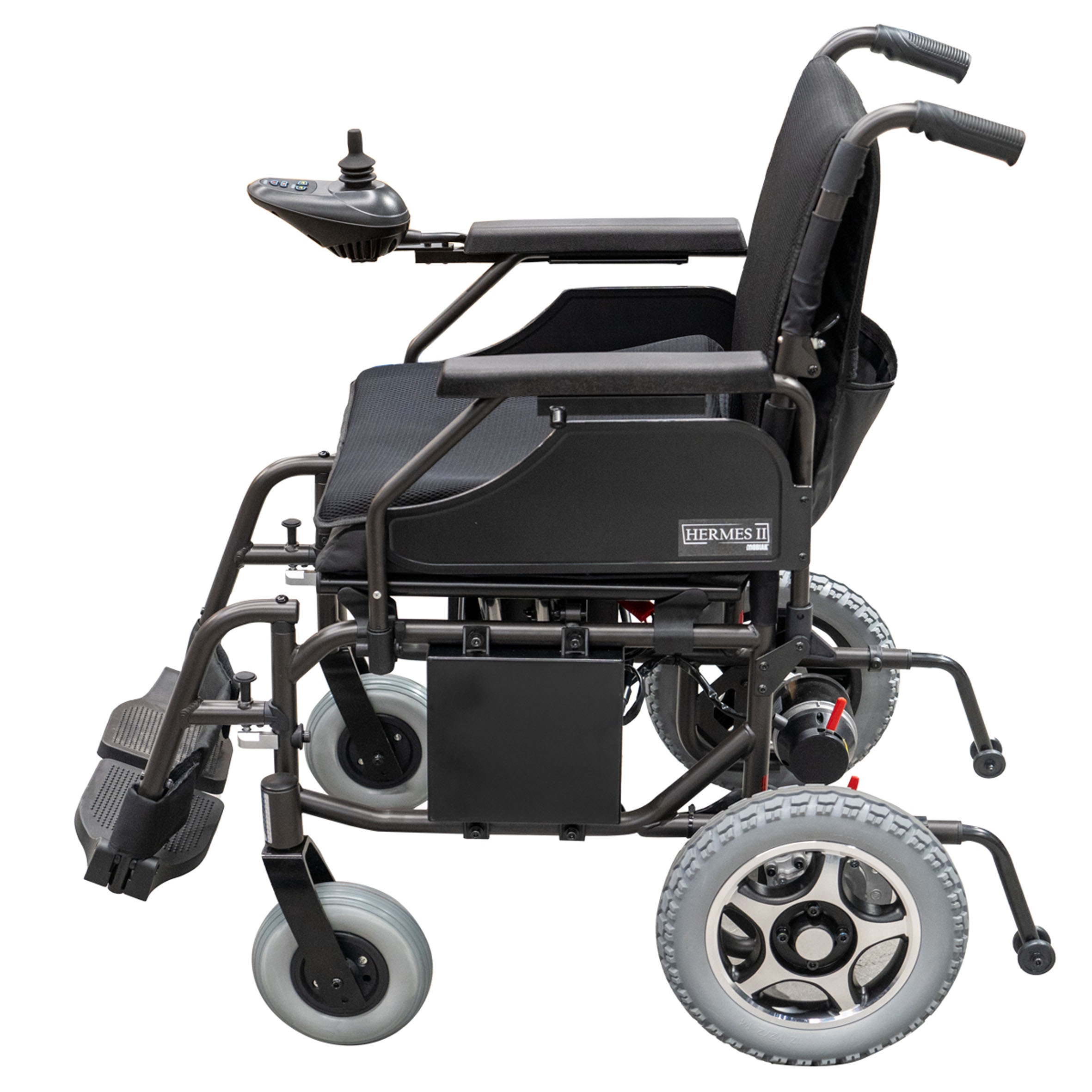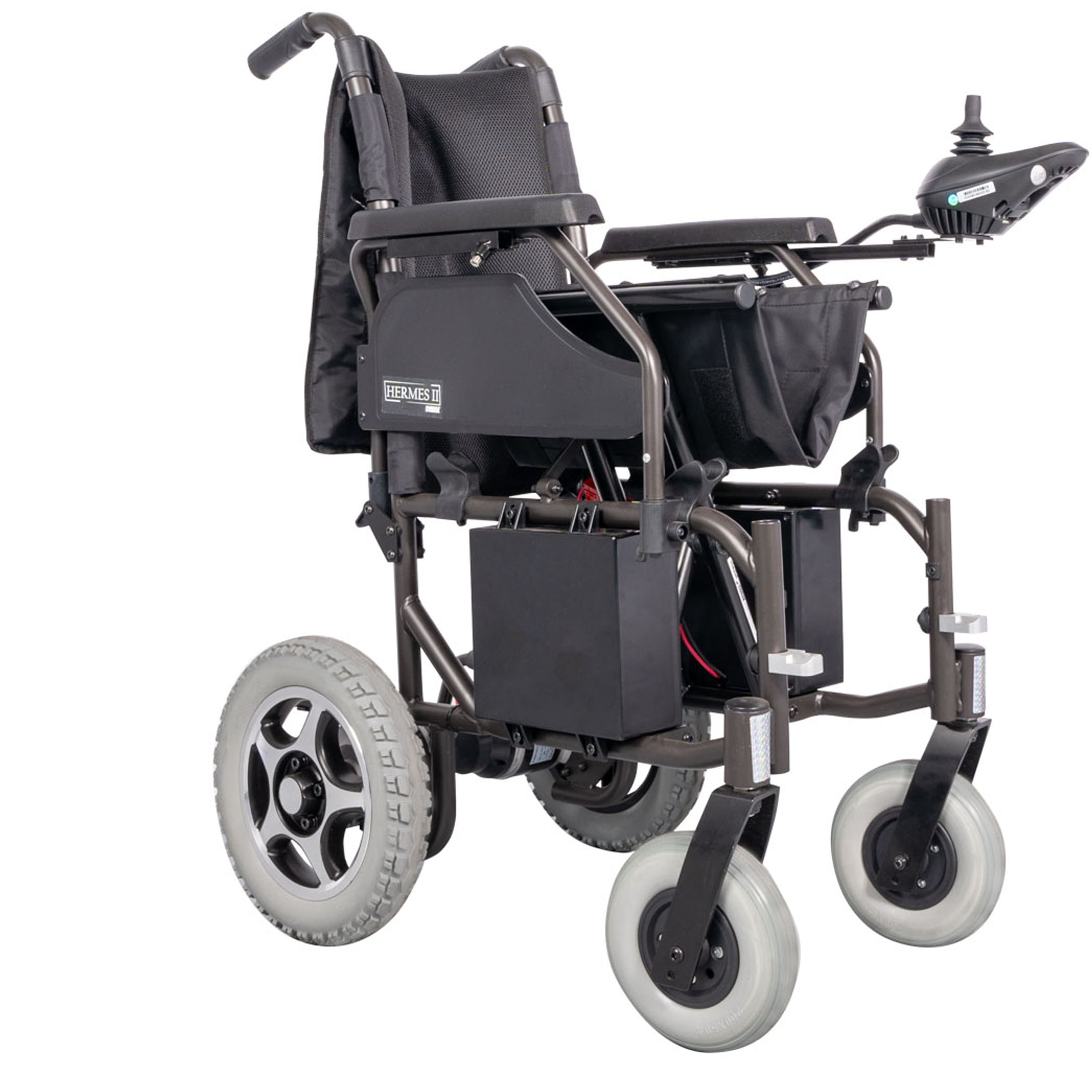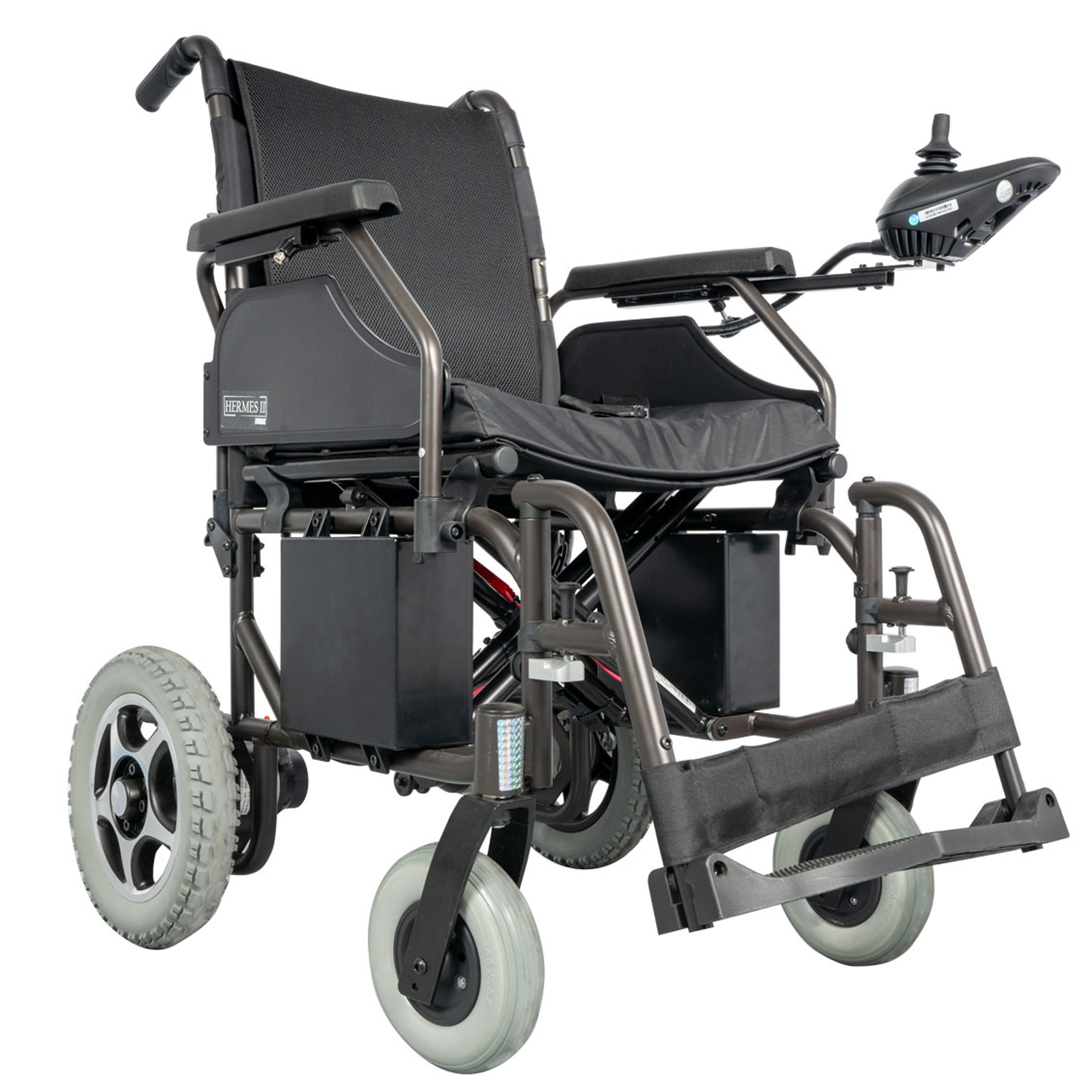 -A Hermes egy elektromos kerekesszék kényelmes üléssel, összecsukhatóval, állítható lábtartóval és dönthető háttámlával a könnyű szállítás és tárolás érdekében.