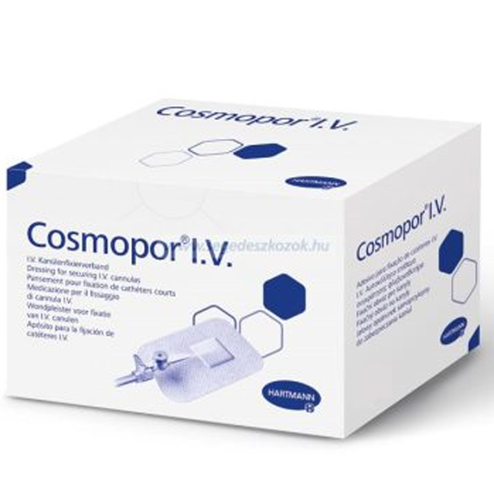 Cosmopor® I.V. öntapadó, steril kanülrögzítő integrált sebpárnával és plusz egy kiegészítő párnával.