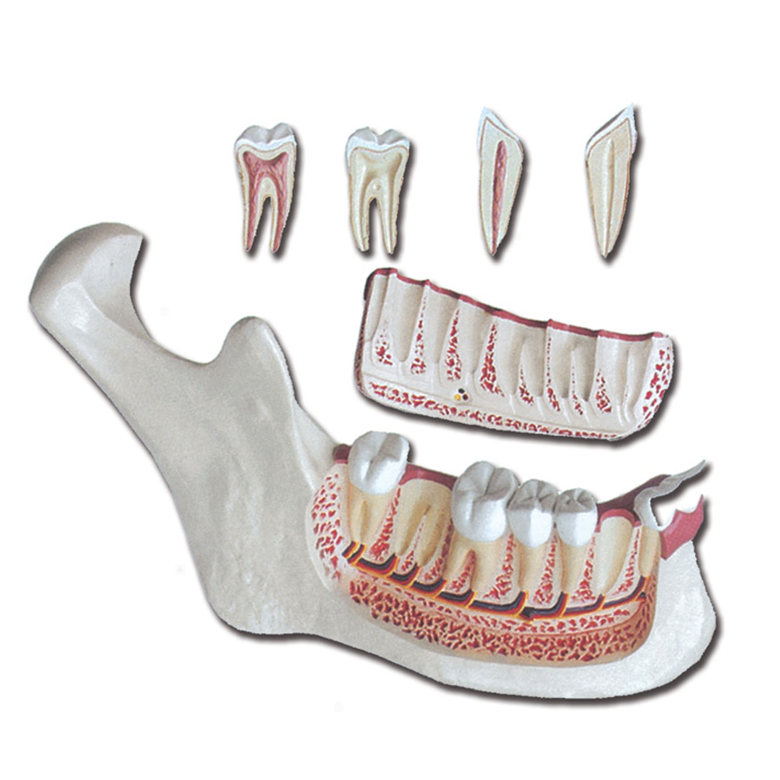 A modell egy része eltávolítható, így láthatóvá válik a foggyökerek és a csont belső felépítése.