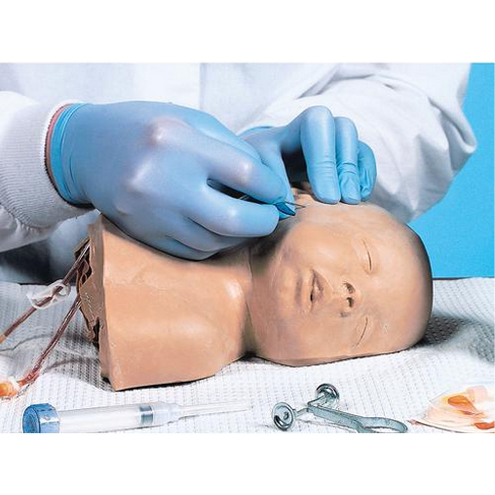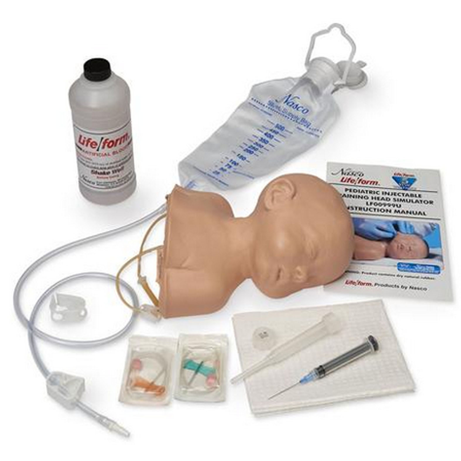 A temporalis és jugularis vénákba adott infúzió és injekció bemutatásának és gyakorlásának felbecsülhetetlen eszköze, újszülött kortól 12 hónapos csecsem?ig. A nyak puha, hajlékony szivacsból készült, így a tapintás és szúrás életh?. A gyermekfej a következ?ket tartalmazza: