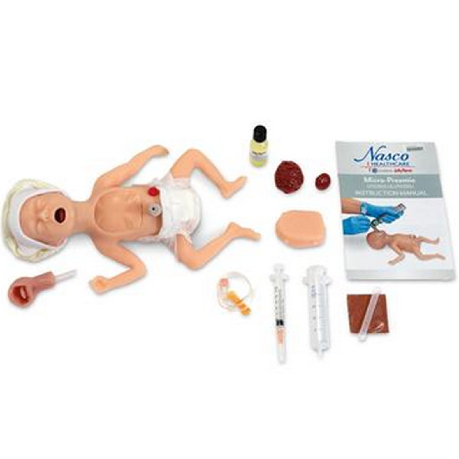 Tartalmaz: Micro-Preemie koraszülött szimulátor, pelenka, sapka (szín változhat) köldök, köldöksérv, nyitott gerinc, kétoldali mellkas blokk, egyoldali mellkas blokk, légút, 3 cc fecskendő, 25G szárnyastű, síkosító, művér por és szerelőalkatrészeket.