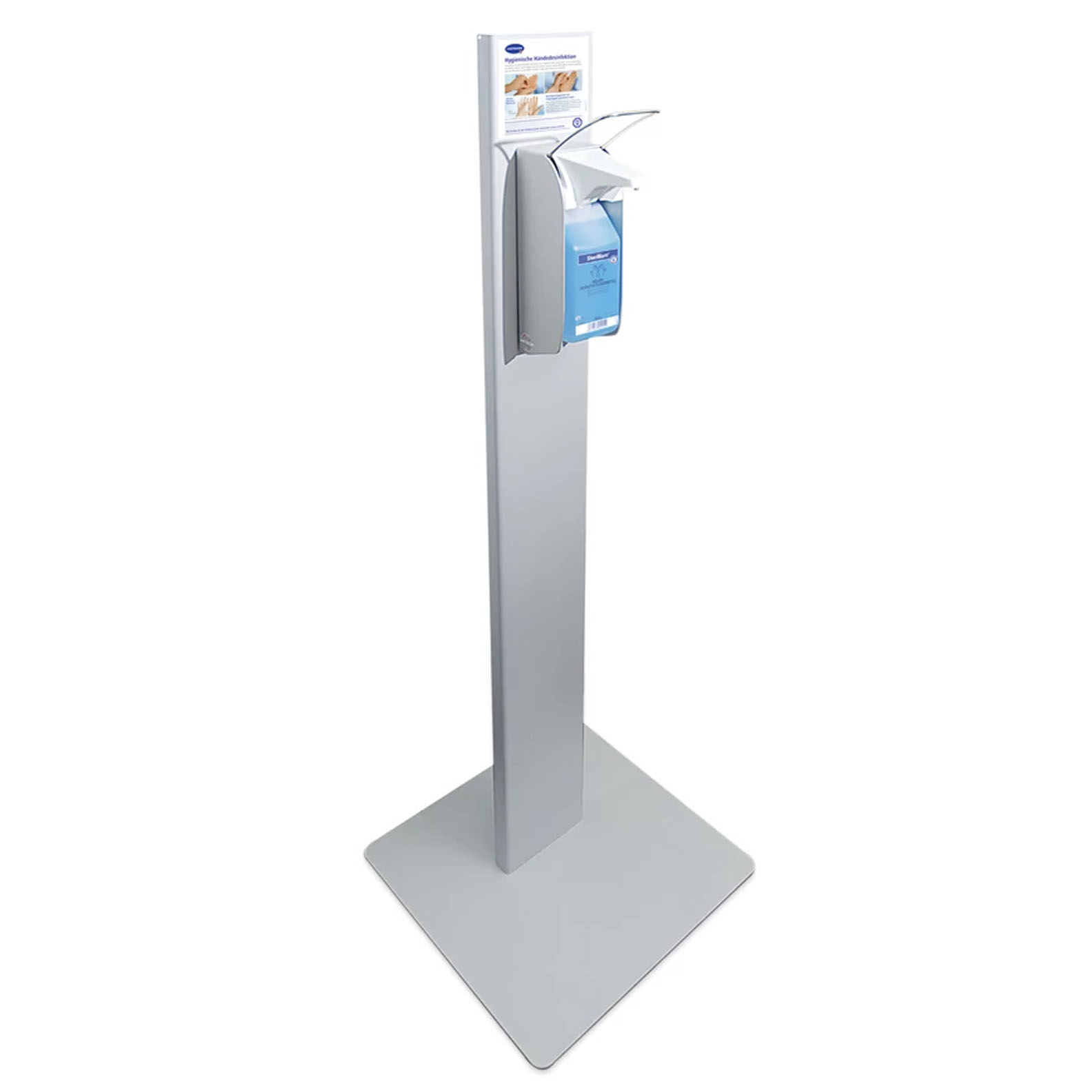 Stabil, rozsdamantes fém állvány kézfertőtlenítőszerek mobil kihelyezéséhez.