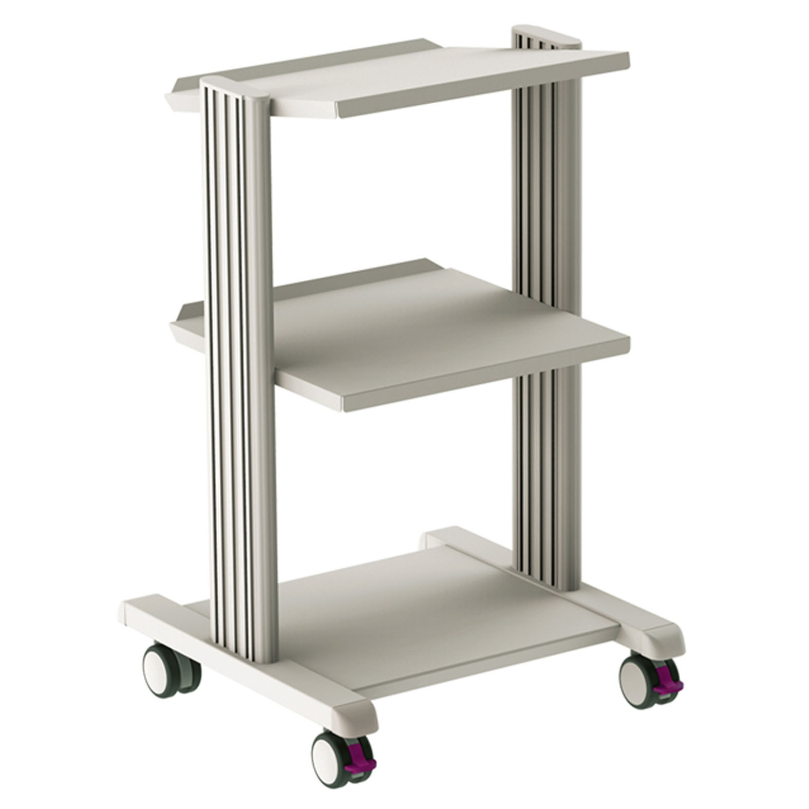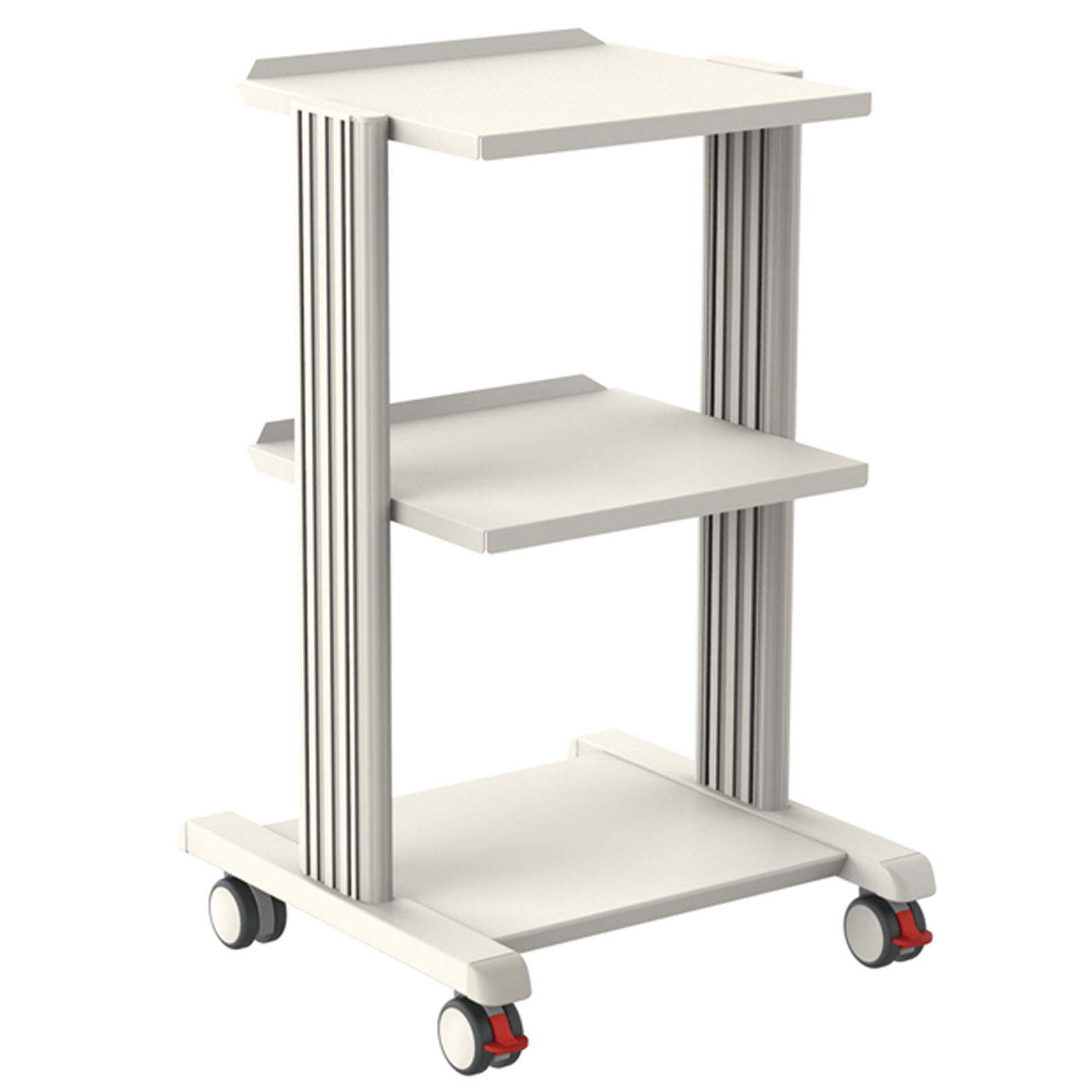 Erős, festett poracél alappal és alumínium kerettel ellátott, 3 polc, hátoldalon védőszéllel, különböző magasságban állítható.