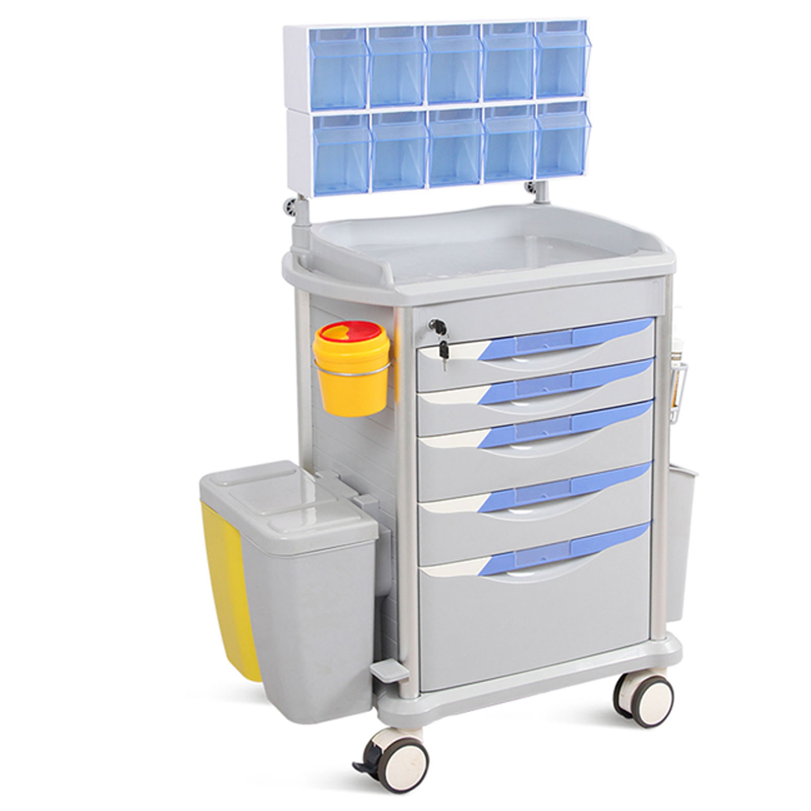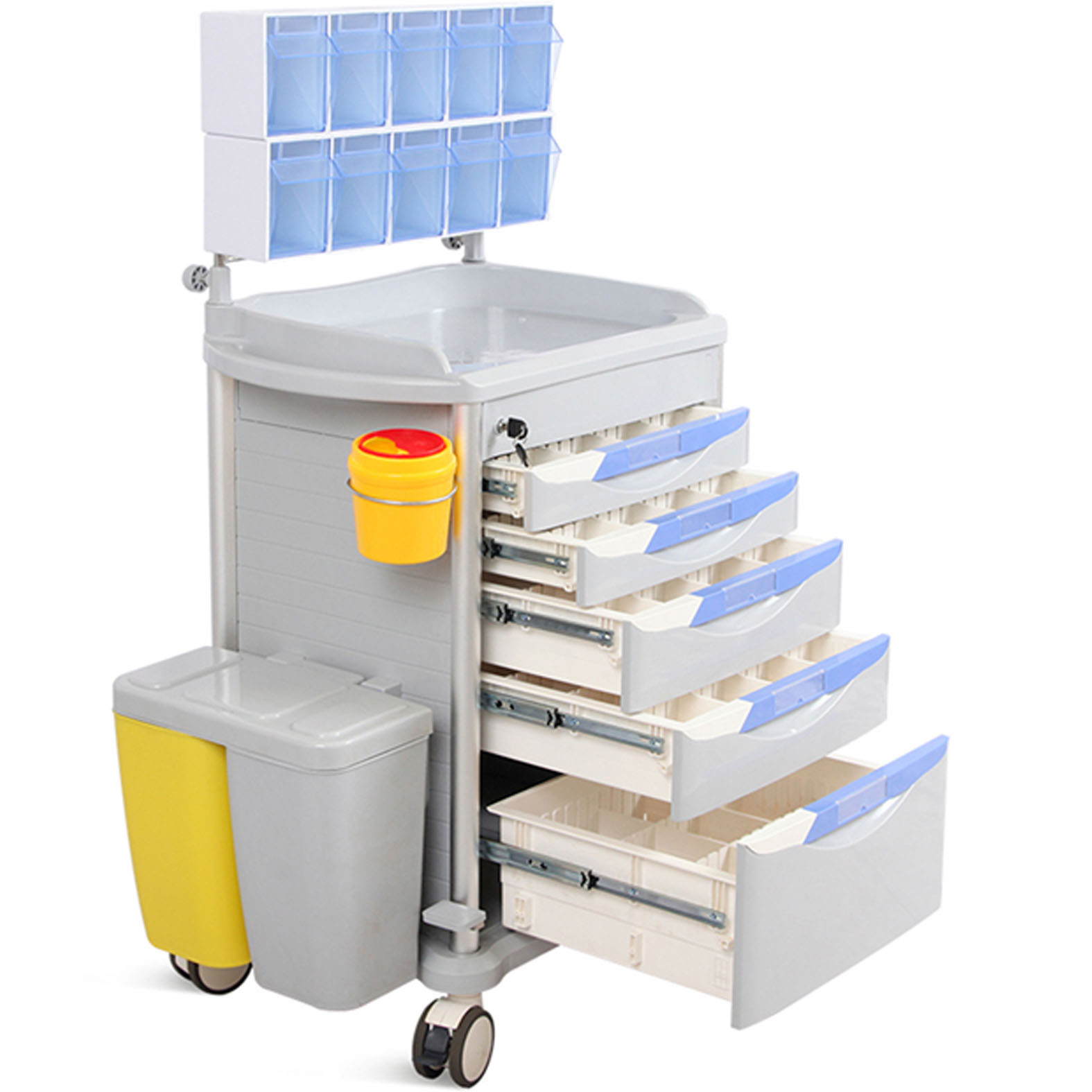 5 tágas és mély fiókkal rendelkezik elválasztókkal, valamint 4 db antisztatikus Ø 10 cm-es kerékkel (ebből 2 fékkel ellátva).