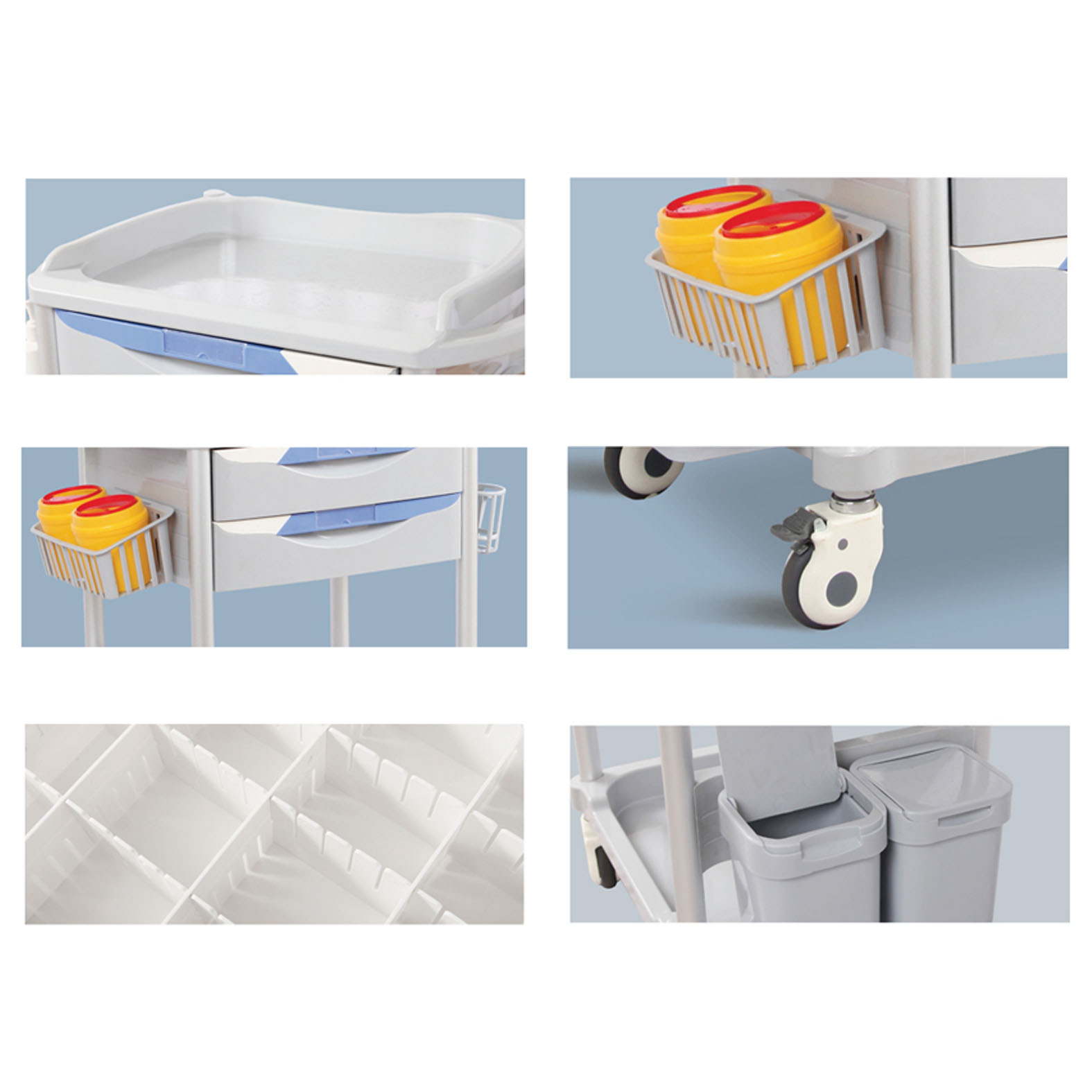 Kezelőkocsi, amely kívül ABS és antibakteriális anyagokból készült, belső szerkezete pedig acélból és alumíniumból áll.