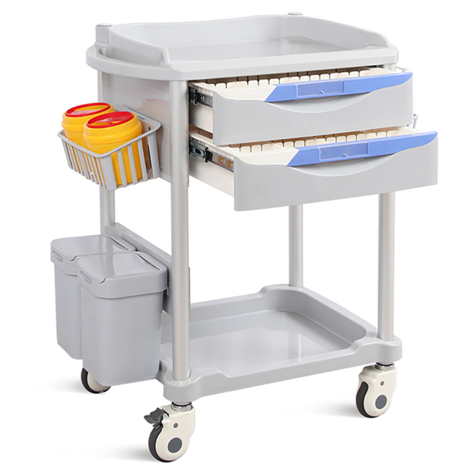 Négy darab, Ø 10 cm-es görgővel van felszerelve (ebből kettő fékezhető), valamint két fiókkal rendelkezik ABS betétekkel, amelyek szabadon rendszerezhetők.