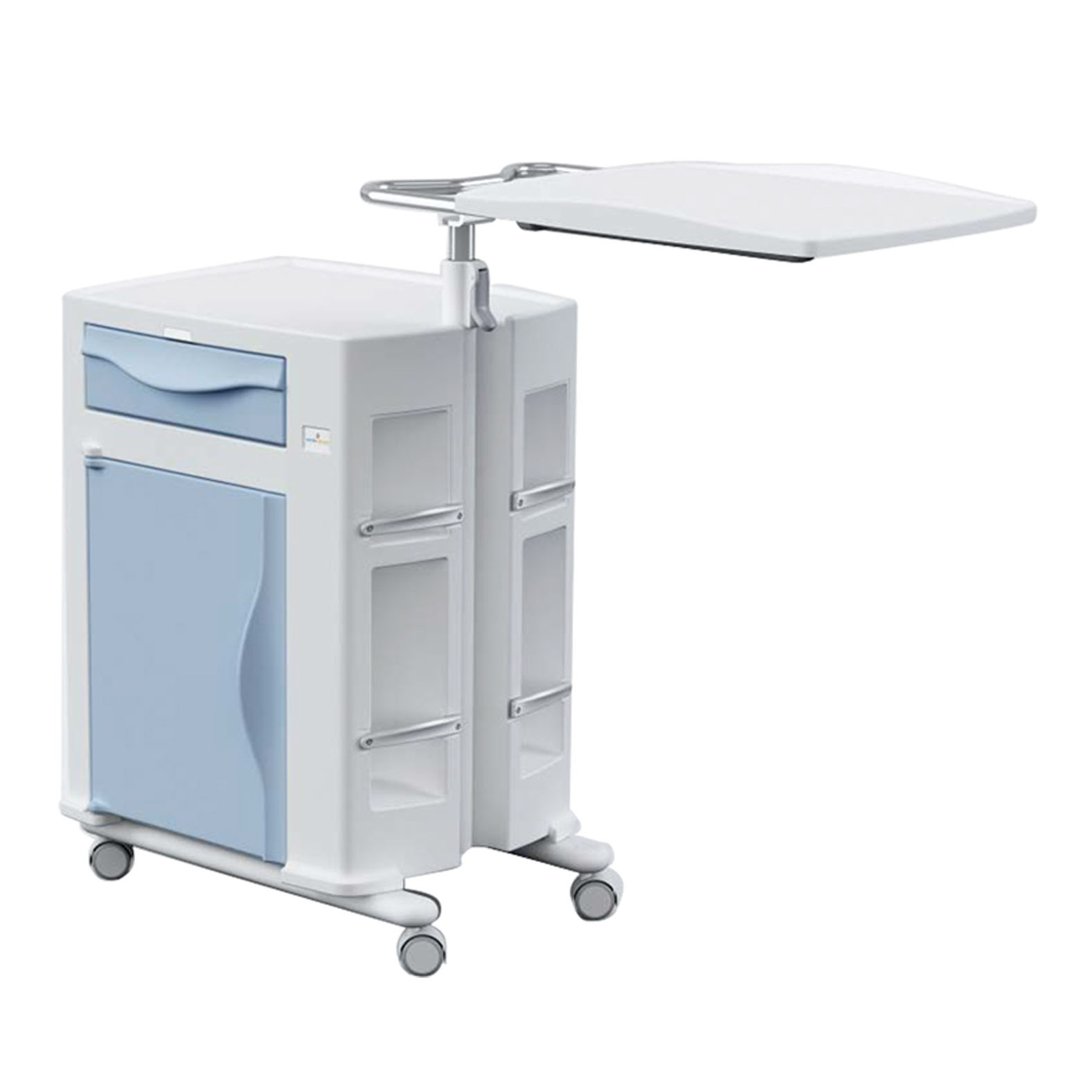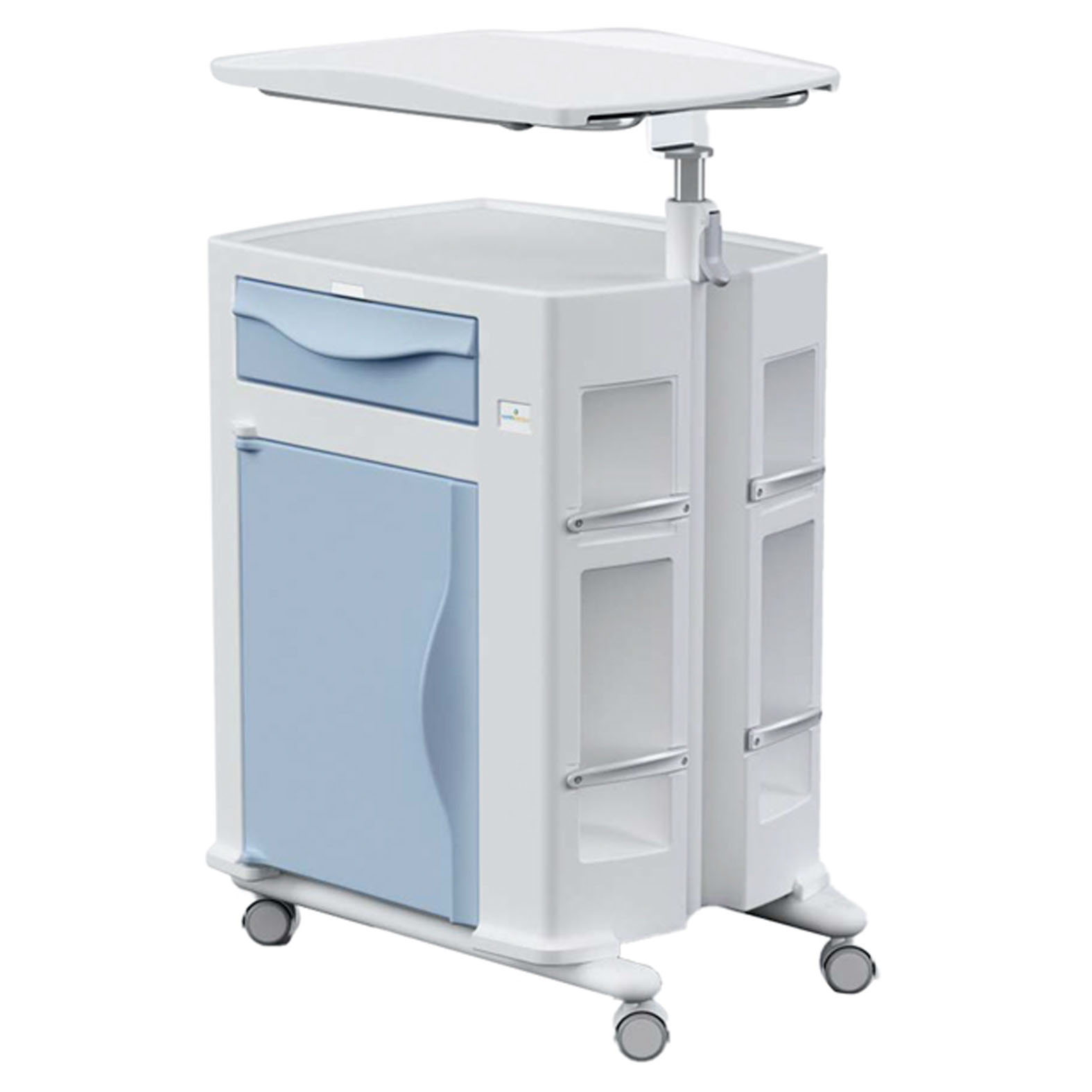 Az Olympus éjjeli szekrény dupla oldalon használható, polietilénből készült, praktikus kórházi vagy egészségügyi környezetbe. A készülék tartozéka az állítható magasságú tálca, amely további kényelmet biztosít a betegek és az ápolószemélyzet számára.