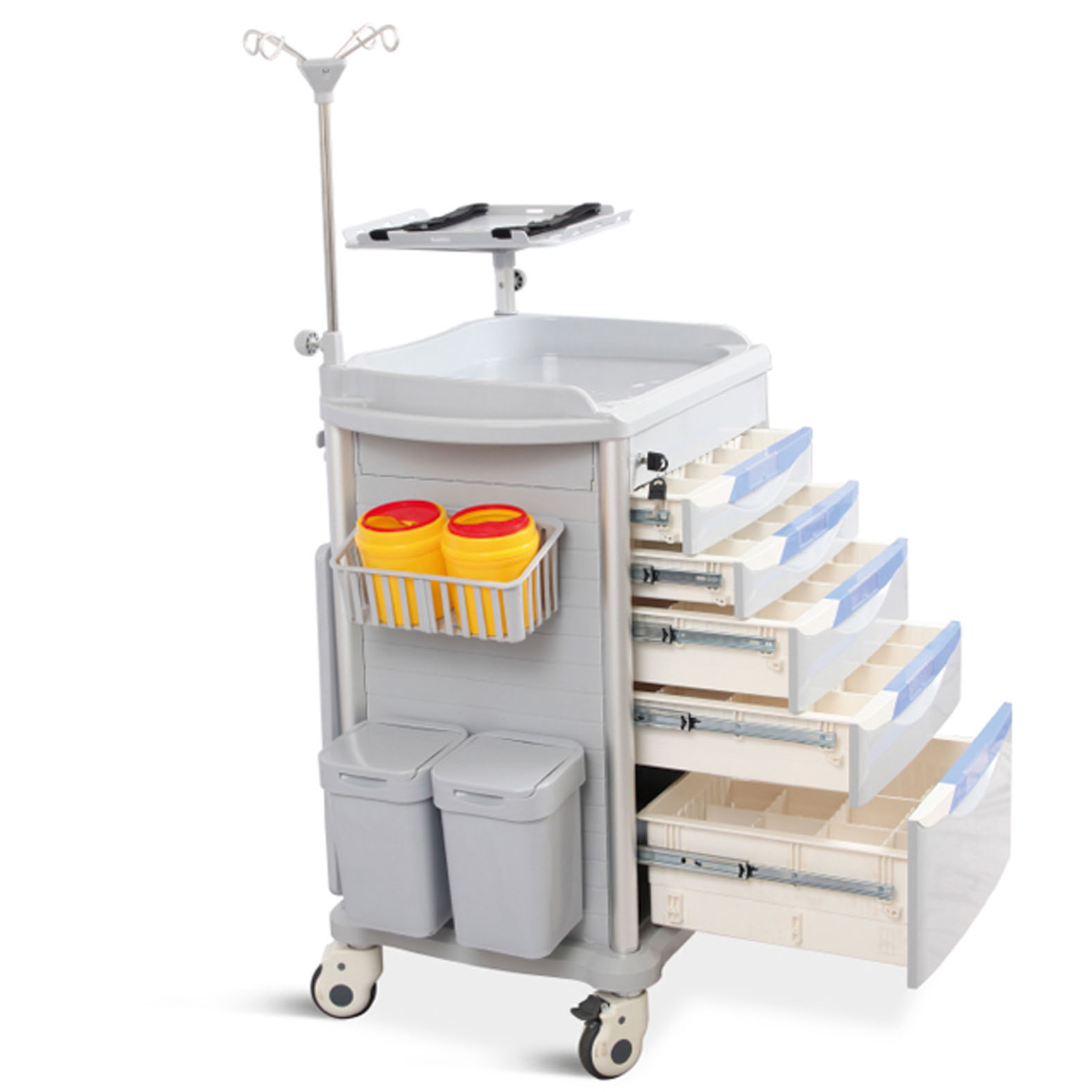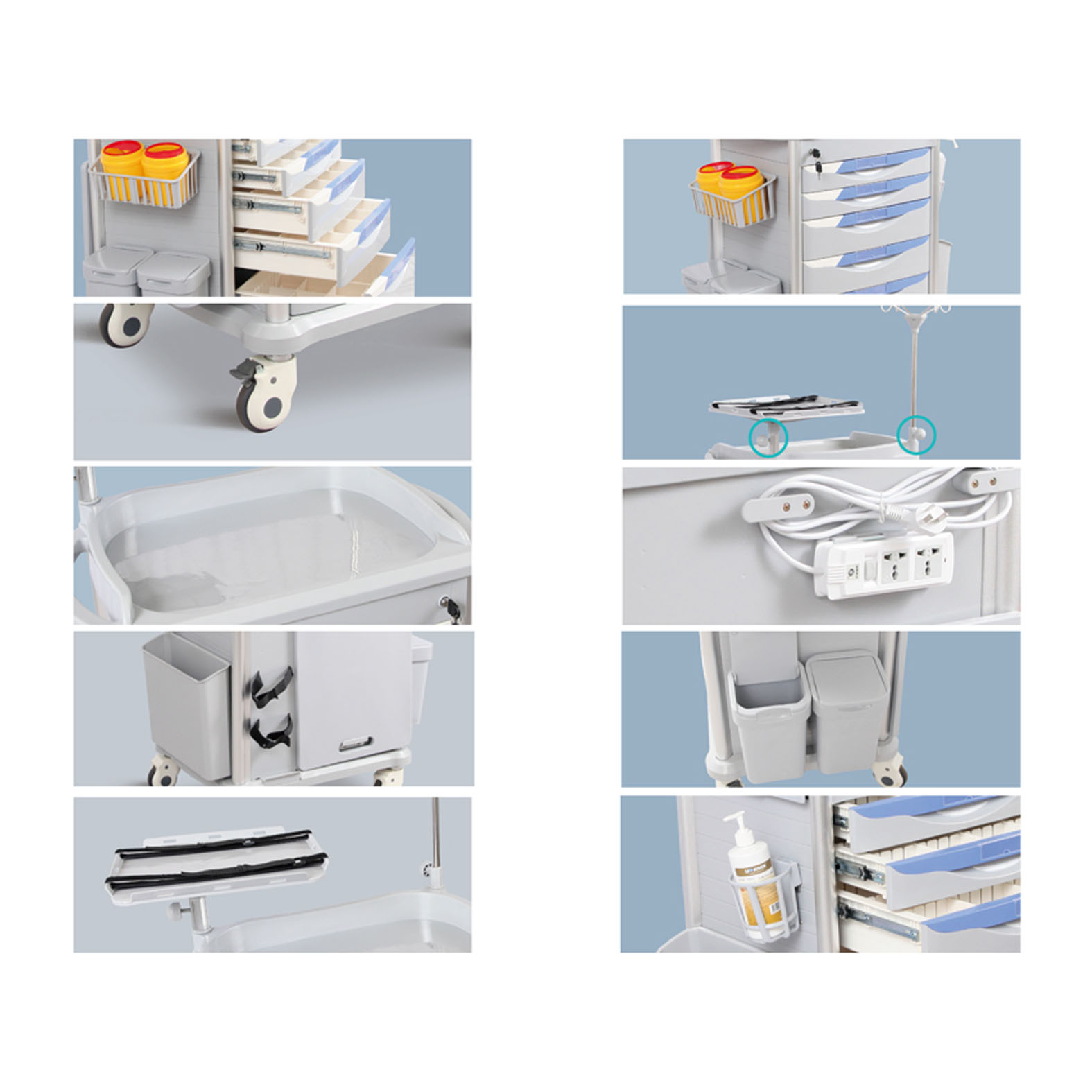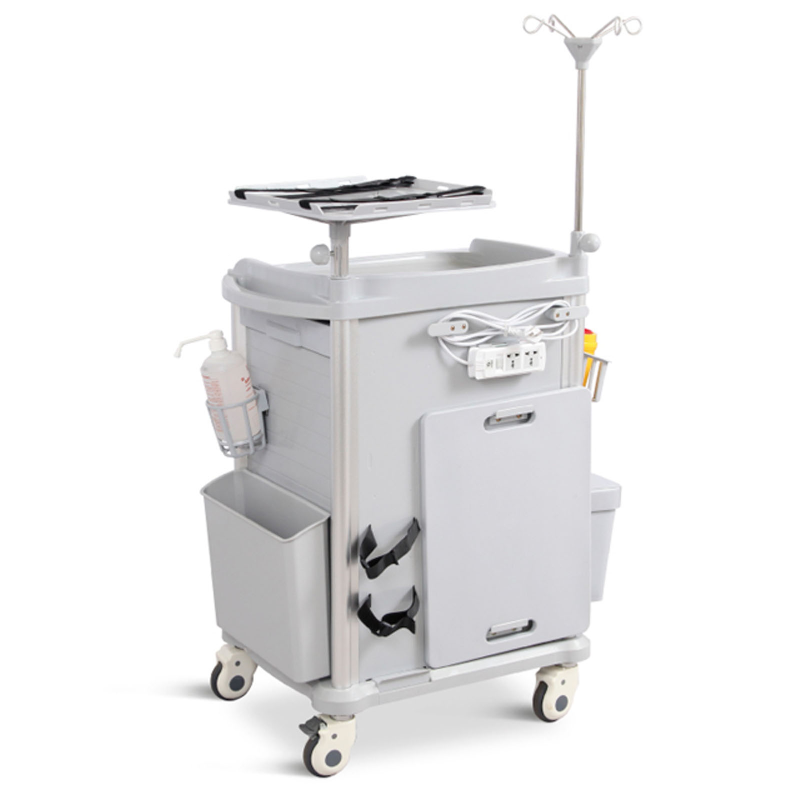 Vészhelyzeti kocsi ABS-ből és antibakteriális külső anyagból, míg a belső szerkezete acélból és alumíniumból készült.