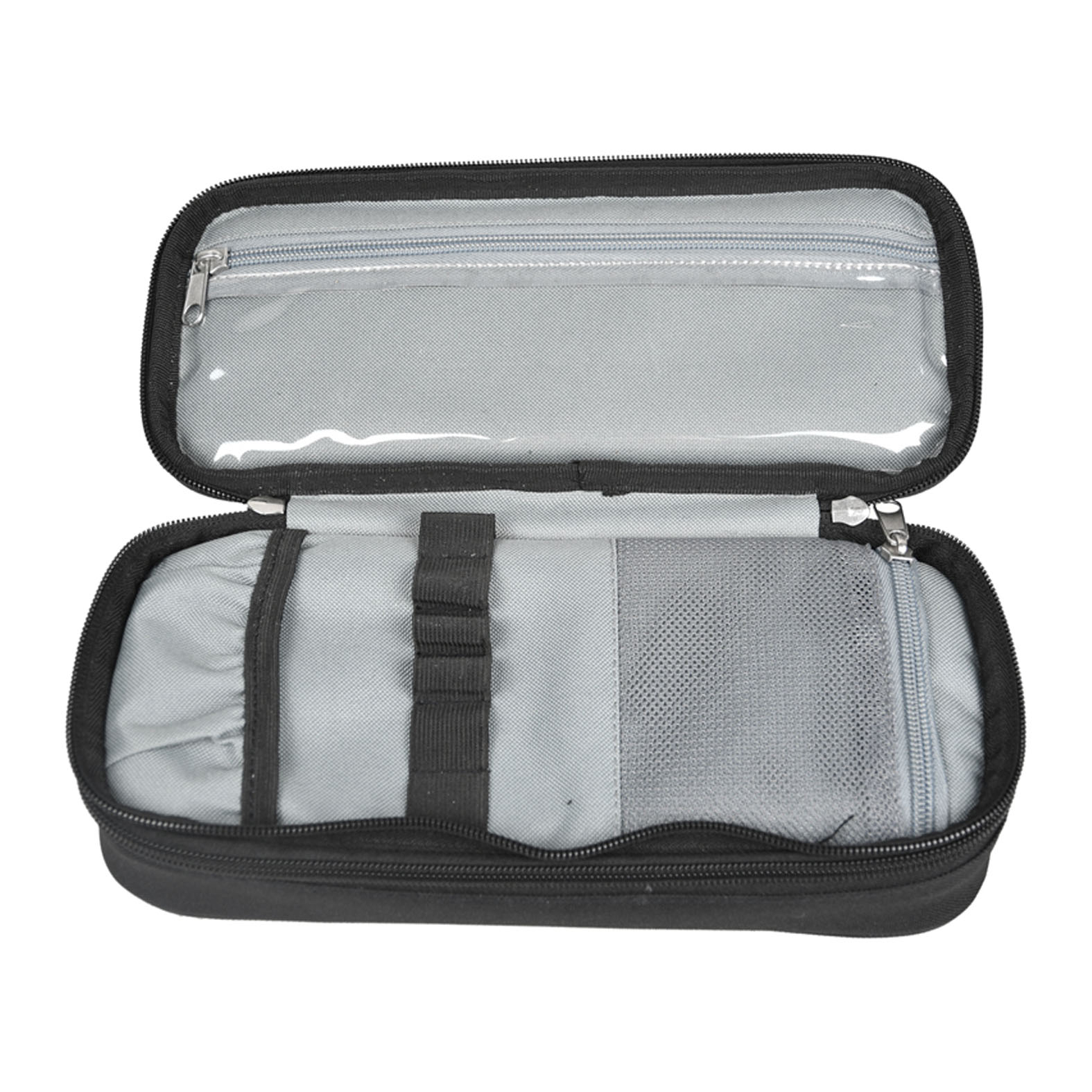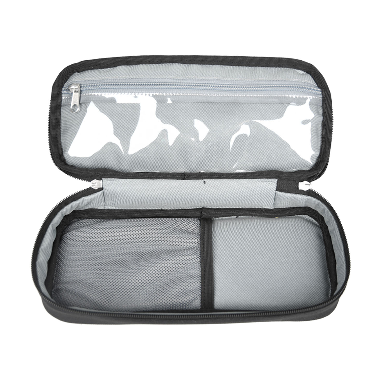 - A felső rekeszben 6 gumipánt, egy átlátszó cipzáras zseb és egy hálós zseb kapott helyet.