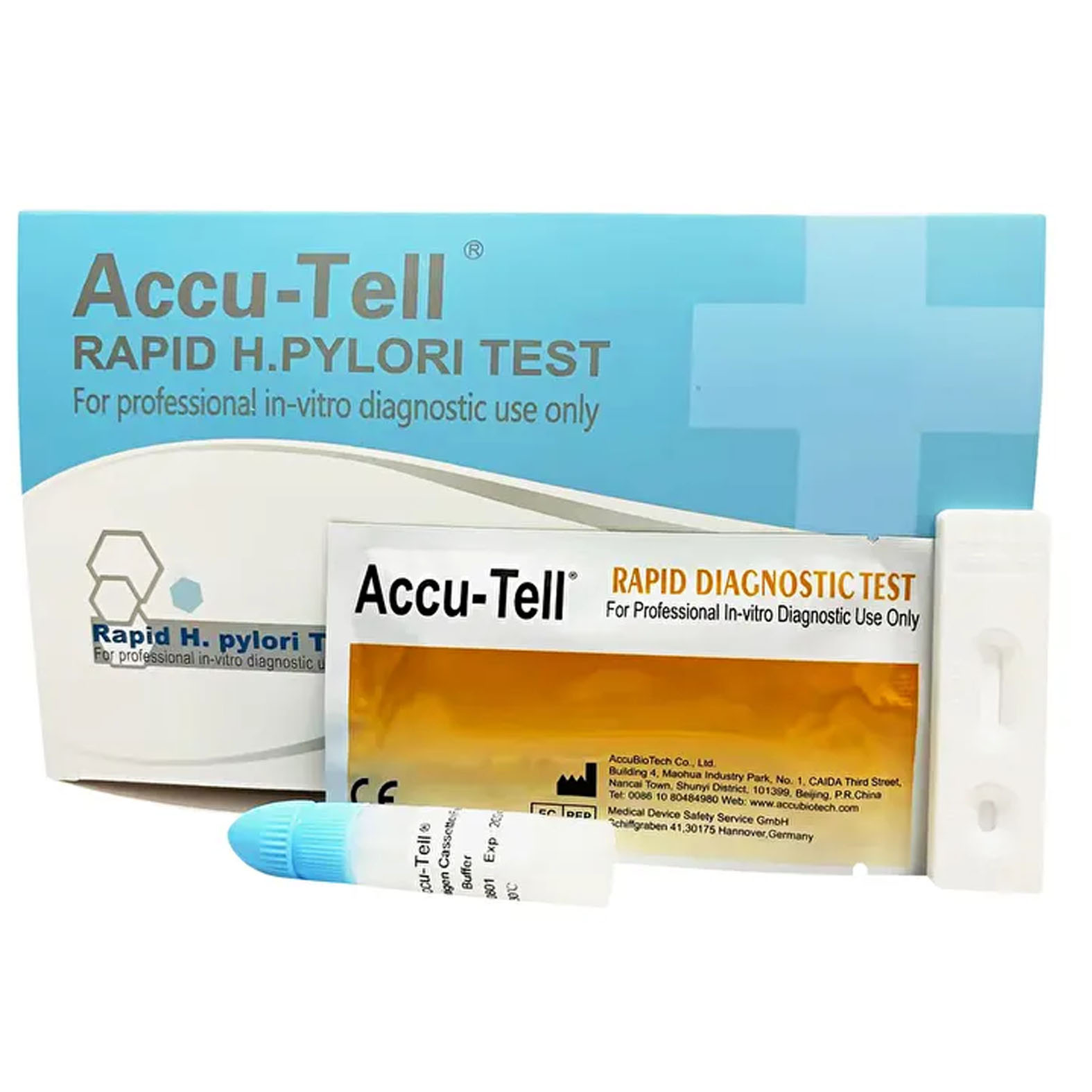 - az AccuBio Tech Accu-Tell® H. pylori antigén gyorstesztje egy gyors kromatográfiás immunvizsgálati módszer a H. pylori antigének kvalitatív kimutatására emberi székletmintákban, a H. pylori fertőzés diagnosztizálásának elősegítésére