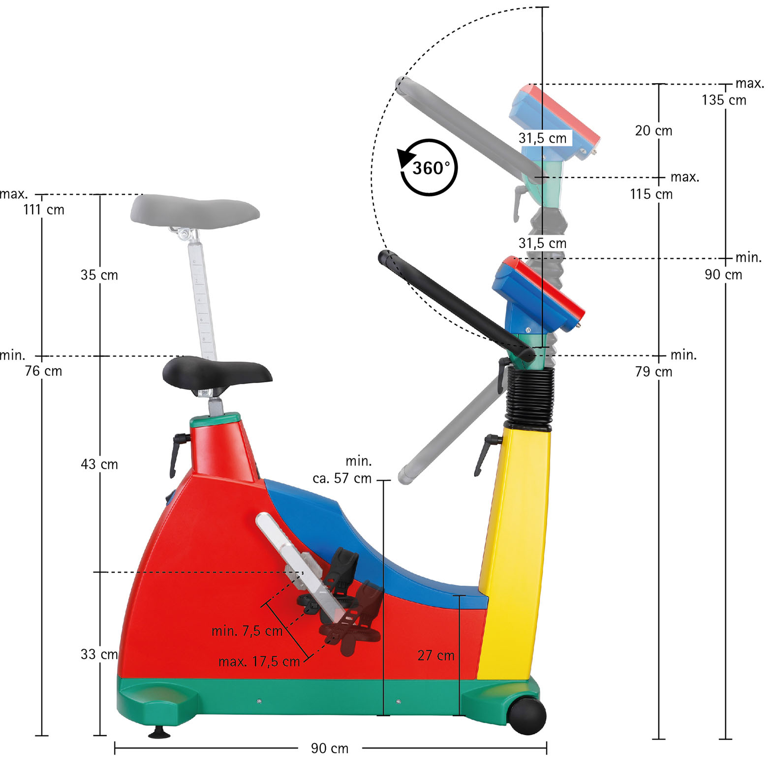 - Az extra hosszú kormány 360°-os elforgatási lehetősége mellett a gyermek ergométer mechanikus, fokozatmentes kormánymagasság-állítást is kínál.